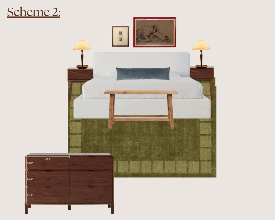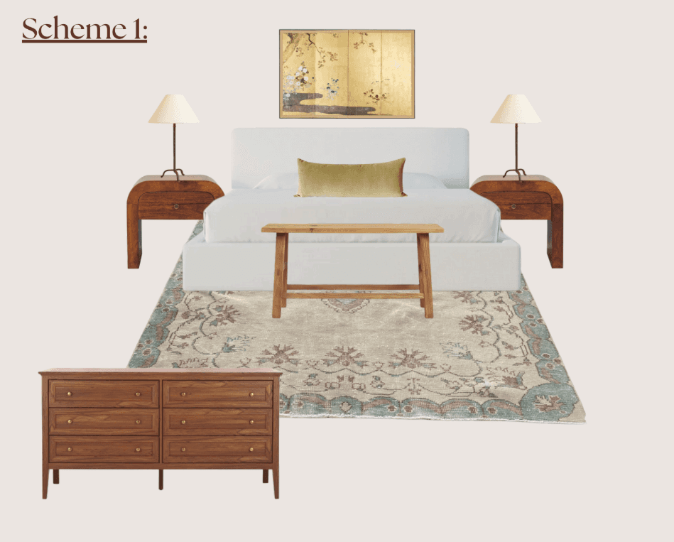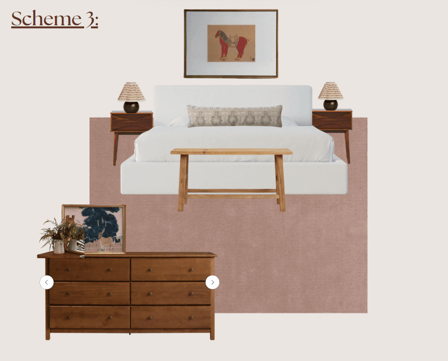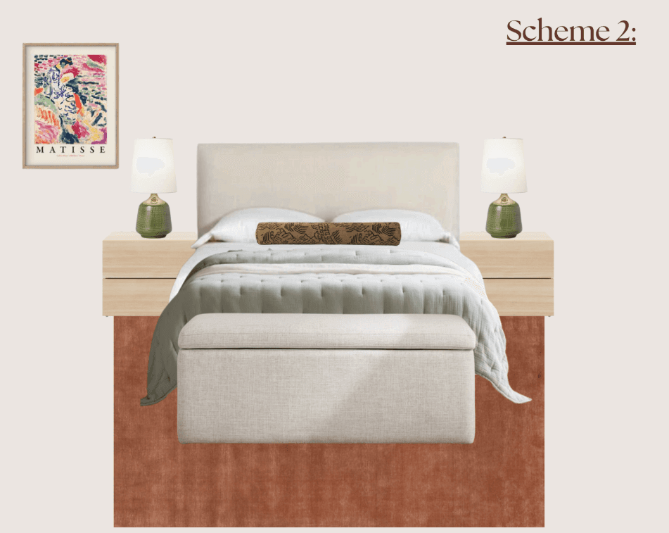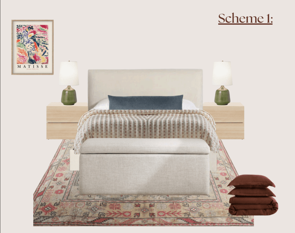 For this project, Sam loved her existing bed and wanted to keep it as the focal point of the room. I worked on sourcing all the other pieces—like nightstands, lighting, and accessories—to create a cozy, inviting space that complemented the bed perfectly. The goal was to keep the room feeling fresh and functional while reflecting the client’s personal style. I focused on choosing pieces that would enhance the overall vibe and make the space feel like a true retreat.
